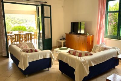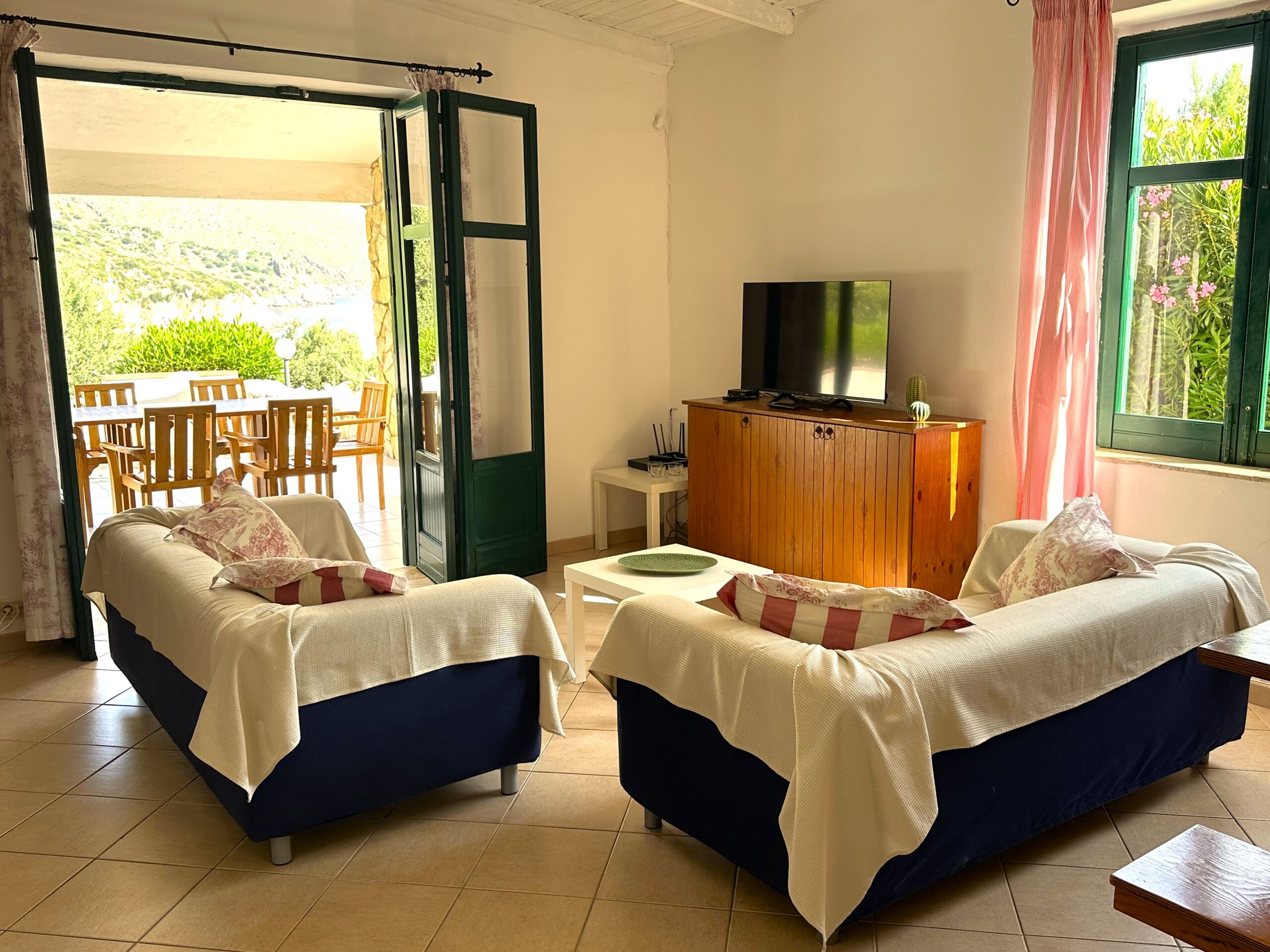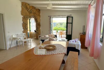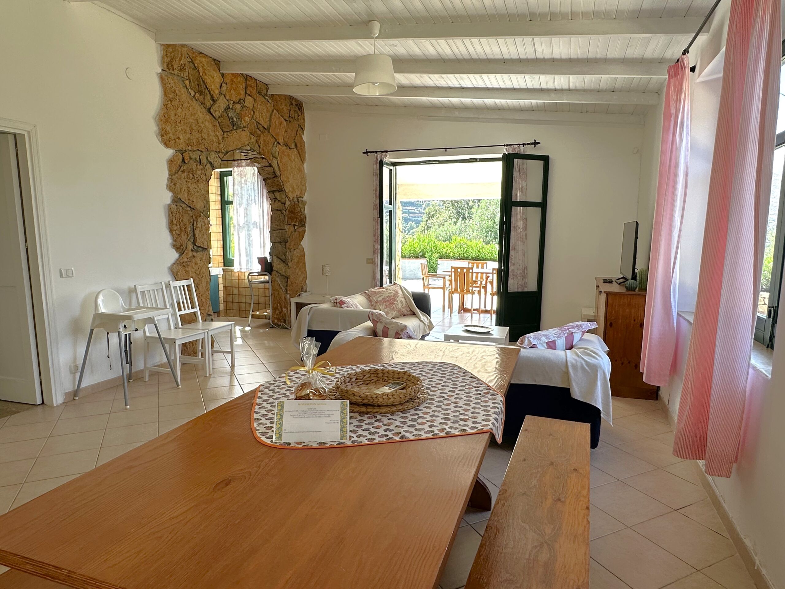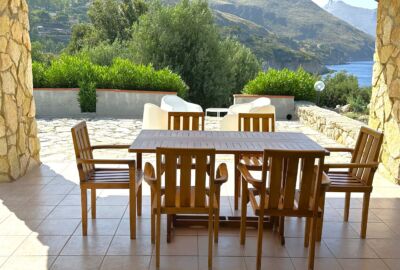 La porta d’entrata apre sul un grande soggiorno diviso in due zone: la zona pranzo con un bel tavolo e panche di legno e la zona salotto ben illuminata grazie ad un’ampia porta finestra che apre sul terrazzo panoramico. Sotto la parte coperta del terrazzo si trova la zona pranzo all’aperto dalla quale la vista sul mare è mozzafiato. Un fico generoso delizierà i più golosi nei mesi di Giugno e luglio con i suoi dolcissimi frutti abbondantissimi! Dal soggiorno si accede alla cucina ben attrezzata, realizzata in muratura con colori turchesi che richiamano i colori del mare.