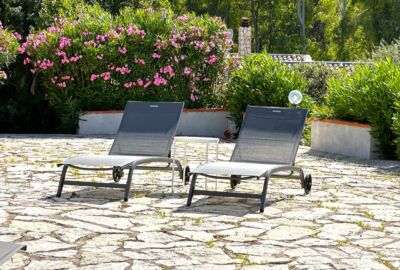 Nella zona notte si trovano tre camere da letto: due camere matrimoniali con vista mare e una camera doppia con due letti singoli con vista giardino. E possibile aggiungere un letto singolo nella camera matrimoniale più grande al fine di accogliere una settima persona. I due bagni sono completi di doccia. La terza doccia è ben riparata nel giardino e sarà molto apprezzata al ritorno dal mare.